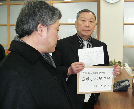 ¡ã ÀÚÀ¯½Ã¹Î¿¬´ë ¼Û¿µÀÎ °øµ¿´ëÇ¥°¡ ȲÀǸ¸ »óÀÓ´ëÇ¥¸¦ ´ë¸®Çؼ­ °¨»ç¿ø ¹Î¿ø½Ç¿¡ ¹ÎÁÖÈ­¿îµ¿½ÉÀÇÀ§¿¡ ´ëÇÑ ±¹¹Î°¨»ç û±¸¼­¸¦ Á¢¼öÇÑ µÚ °¨»çû±¸ °ÑºÀ°ú Á¢¼öÁõÀ» µé¾îº¸À̰í ÀÖ´Ù. ¨Ïkonas.net