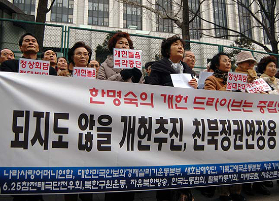 Àü¾÷ÁֺΠµî ¿©¼ºµé·Î ±¸¼ºµÈ '³ª¶ó»ç¶û¾î¸Ó´Ï¿¬ÇÕ'(´ëÇ¥ ±Ç¸íÈ£, ÀÌÇÏ '³ª»ç¿¬') µî ½Ã¹Î´Üü ȸ¿øµéÀº 26ÀÏ ¿ÀÈÄ ±¤È¹® Á¤ºÎÁ¾ÇÕû»ç ÈĹ® ¾Õ¿¡¼ ±âÀÚȸ°ßÀ» °®°í, "µÇÁöµµ ¾ÊÀ» °³ÇåÃßÁøÀº Á¤»óȸ´ã ¿¬¸·Àü¼ú"À̶ó°í ÁÖÀåÇß´Ù.