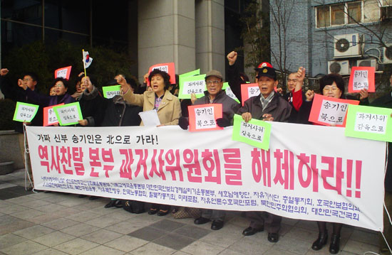À̵é ȸ¿øµéÀº '°ú°Å»çÀ§ °¨¿ÁÀ¸·Î' '¼Û±âÀÎ ºÏÀ¸·Î' µîÀÌ ÀûÈù ÇÇÄÏÀ» Èçµé¸ç '30³â Àü ¿ª»ç µÚÁý±â¿¡ Ç÷¾ÈÀÌ µÈ ÁÂÆÄÁ¤±Ç °ú°Å»ç À§¿øÈ¸ ÇØÃ¼Ç϶ó' '¹Ý¿ªÀ» ¹ä¸Ôµí Çϴ ģºÏ ÁÂÆÄ ¼¼ÀÛÁý´Ü ŸµµÇÏÀÚ' 'ÁÂÆÄ ¼¼ÀÛ Áý´Ü È«À§º´À» °¨½Î´Â °ú°Å»çÀ§´Â ÇØÃ¼Ç϶ó' '¿ª»ç¿Ö°îÀ» ÀÚÇàÇÏ´Â °ú°Å»ç »çÀ̺ñ ¼Û±âÀÎ ½ÅºÎ ¹°·¯³ª¶ó' µîÀÇ ±¸È£¸¦ ¿ÜÃÆ´Ù.