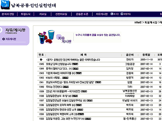 ±èÀϼº¡¤±èÁ¤ÀÏ Âù¾çÀÌ ¾Õ¼ ¾ð±ÞÇÑ´ë·Î "6¡¤15°øµ¿¼±¾ðÀÇ Á¤½Å"¿¡ ºÎÇյǴ °ÍÀ̶ó°í »ý°¢ÇÏ´Â °ÍÀÎÁö Àǹ®ÀÌ´Ù. ÀÚÀ¯°Ô½ÃÆÇ¿¡µµ "°øµ¿¼±¾ð Á¤½Å¿¡ À§¹èµÇ´Â ±ÛÀº »èÁ¦ÇϰڽÀ´Ï´Ù"¶ó´Â °øÁö¹®ÀÌ ºÙ¾î ÀÖ¾î, '°Ô½Ã¹° ¼±º° ÀÛ¾÷'ÀÌ ÀÖ´Ù´Â Á¡À» ½Ã»çÇϰí ÀÖ´Ù.