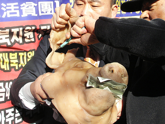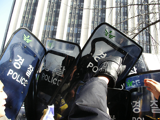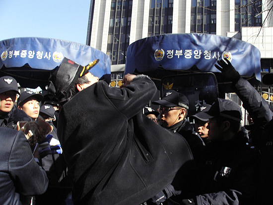 ¼º¸í ¹ßÇ¥ µî ±âÀÚȸ°ßÀ» ¸¶Ä£ Âü°¡ÀÚµéÀº ¼º¸í¼­ ¹× 'µÅÁö¸Ó¸®'¸¦ ÅëÀϺο¡ Àü´ÞÇϱâ À§ÇØ Ã»»ç ÁøÀÔÀ» ½ÃµµÇßÀ¸³ª, °æÂûÀÌ ÀÜ¶à ±äÀåÇÑ ¸ð½ÀÀ» º¸ÀÌ¸ç Æ÷À§¸ÁÀ» Æì´Â µî Àû±Ø ÀúÁöÇß´Ù. '»ýÀϼ±¹°(?) Àü´Þ'¿¡ ½ÇÆÐÇÑ ½Ã¹Î´Üü ȸ¿øµéÀº ±èÁ¤ÀÏÀ» »ó¡ÇÏ´Â 'µÅÁö¸Ó¸®'ÀÇ ±Í¸¦ Àß¶ó û»ç ¾ÈÀ¸·Î ´øÁ³°í, ÀÌÈÄ °æÂûÀº ¹æÆÐ¸¦ ³ôÀÌ Ä¡Äѵé°í °æ°è¸¦ °­È­Çß´Ù.