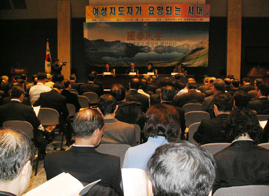 ÀÌ ³¯ ¼¿ï Áß±¸ ÅÂÆò·Î Çѱ¹ÇÁ·¹½º¼¾ÅÍ ±¹Á¦È¸ÀÇÀå¿¡¼ ¿¸° Åä·Ðȸ¿¡´Â Æ÷·³ ȸ¿øµéÀ» Æ÷ÇÔÇØ ÀÏ¹Ý ½Ã¹ÎµéÀÌ ±¹Á¦È¸ÀÇÀåÀ» °¡µæ ¸Þ¿ö ´ë¼±ÀÇ ÇØ¿¡ ½ò¸®´Â °ü½ÉÀ» ¹Ý¿µÄÉ Çß´Ù. ±×·¯³ª '¿©¼º ÁöµµÀÚ'¸¦ ÁÖÁ¦·Î ÇÑ Åä·Ðȸ¿¡µµ ¹æÃ»¼®ÀÇ ´ëºÎºÐÀº ³²¼º ûÁßµé·Î ä¿öÁ® ¾ÆÁ÷Àº ¿©¼ºµé »çÀÌ¿¡¼µµ ³²¼º Áß½ÉÀÇ »ç°í°¡ ¿©ÀüÇÏÁö ¾Ê³ª ÇÏ´Â »ý°¢ÀÌ µé°Ôµµ Çß´Ù.(Konas)