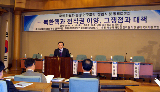 ¡®¾Èº¸¿Í µ¿¸Í ¿¬±¸ Æ÷·³¡¯Àº ºÏÇÙ¹®Á¦¿Í ÀüÀÛ±Ç È¯¼ö¹®Á¦°¡ µ¿½Ã¿¡ ¸Â¹°·Á µ¹¾Æ°¡´ø ÀÛ³âÀÌ·¡, ±¹È¸ ±¹¹æÀ§ÀÇ Çѳª¶ó´ç ȲÁøÇÏ ÀÇ¿øÀ» ÇʵηΠ¿¸°¿ì¸®´çÀÇ Á¶¼ºÅÂÀÇ¿ø°ú ¹ÎÁÖ´çÀÇ ±è¼ÛÀÚ ÀÇ¿ø ¿Ü ¿©·¯ ÀÇ¿øµéÀ» Áß½ÉÀ¸·Î ÃÊ´çÀû ºÐÀ§±â ÇÏ¿¡ ¼³¸³ÀÌ ³íÀÇµÈ ´Üü·Î¼ ÀÌ ³¯ ù Ãâ¹ß Å×ÀÌÇÁ¸¦ ²÷Àº °ÍÀÌ´Ù