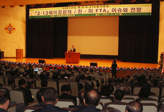 '2¡¤13 º£ÀÌ¡ ÇÕÀÇ / ÇÑ¹Ì FTA À̽´¿Í Àü¸Á'À» ÁÖÁ¦·Î ÇÑ À̹ø Æ÷·³¿¡´Â ÇÙ Àü¹®°¡ÀÎ ±èÅ¿ì Çѱ¹±¹¹æ¿¬±¸¿ø ¼±ÀÓ¿¬±¸À§¿ø°ú ÇÑ¹Ì FTA¸¦ Ÿ°áÇÑ ±èÁ¾ÈÆ ¼ö¼®´ëÇ¥°¡ ¹ßÁ¦ÀÚ·Î ³ª¿Í 2¡¤13 ÇÙ ÇÕÀÇ ÀÌÈÄ Çѱ¹ÀÇ ´ëó¿Í ¹Ì±¹°úÀÇ FTAÇù»ó °úÁ¤ ¹× ÇâÈÄ ÀÏÁ¤¿¡ ´ëÇØ ÁÖÁ¦¹ßÇ¥Çß´Ù.