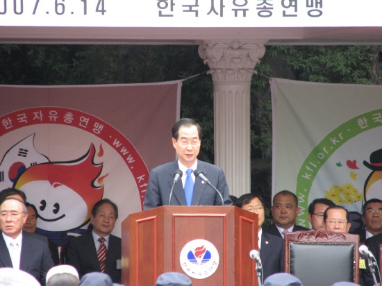 ÇÑÆí À̳¯ Çà»ç¿¡ Âü¼®ÇÑ ÇÑ´ö¼ö ±¹¹«ÃѸ®´Â °Ý·Á»ç¿¡¼ ÀÚÀ¯ÃÑ¿¬¸ÍÀÌ Á¦ 2ÀÇ ¾Èº¸µ¿¸ÍÀÎ ÇÑ¹Ì FTA Çù»ó°ú °ü·ÃÇØ ´ë±¹¹Î È«º¸¿¡ ³ª¼ Áö¿øÇØ ÁØ °Í¿¡ ´ëÇØ °¨»çÀÇ ¶æÀ» Ç¥Çß´Ù.(Konas)
