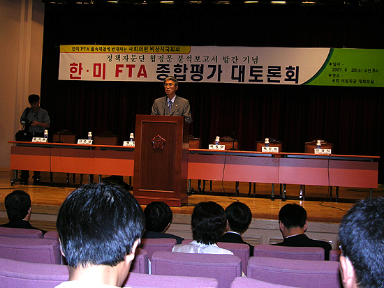¹Î»ýÁ¤Ä¡¸ðÀÓ ÃµÁ¤¹è(Àü ¹ý¹«ºÎÀå°ü) ÀÇ¿øÀº Àλ縻À» ÅëÇØ "FTA°¡ öÀúÇÏ°Ô ¹Ì±¹ÀÇ ÆäÀ̽º´ë·Î ÁøÇàµÆ´Ù"¸ç "¹Ì±¹¿¡ ²ø·Á´Ù´Ñ Á¤ºÎÀÇ Åµµ¿¡ Àý¸Á°ú ºÐ³ë¸¦ ±ÝÇÒ ¼ö ¾ø´Ù"°í ¹àÇû´Ù.