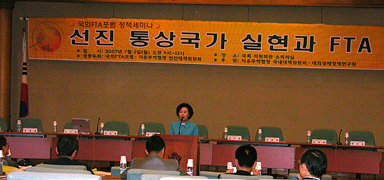 | ¡ã º¸°í¼°¡ ¹èÆ÷µÈ 2ÀÏ ±¹È¸ÀÇ¿øÈ¸°ü¿¡¼ ¿¸° '¼±ÁøÅë»ó±¹°¡ ½ÇÇö°ú FTA' Åä·Ðȸ. ±è¸íÀÚ ÀÇ¿øÀÌ °³È¸»ç¸¦ Çϰí ÀÖ´Ù. ±×´Â ³ë´ëÅë·ÉÀÇ FTA °ü·Ã ¹ß¾ðµéÀ» "¿ë±âÀÖ´Ù"°í ÆòÇß´Ù. ¨Ïkonas.net |