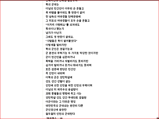 Á¤ ¾¾´Â ÇöÀç ±¹°¡º¸¾È¹ý À§¹Ý ÇøÀÇ·Î ¾Ð¼ö¼ö»ö ¹× ºÒ±¸¼Ó¼ö»ç¸¦ ¹Þ°í ÀÖ´Ù. ½ÇÁ¦·Î ±×´Â ÀÎÅͳݰø°£¿¡ ºÏÇÑÀ» Âù¾çÇÏ°í ´ëÇѹα¹À» ºñÇÏÇÏ´Â ±ÛÀ» ¼öÂ÷·Ê °ÔÀçÇØ¿Ô´Ù. Áö³ 2¿ù3ÀÏ Àü±¹³ó¹ÎȸÃÑ¿¬¸Í(Àü³ó) ȨÆäÀÌÁö °Ô½ÃÆÇ¿¡ ¿Ã¸° ¡ºÀ̺ÏÀÇ ±º´ë¸¦ ¸»ÇÑ´Ù¡»¶ó´Â Á¦¸ñÀÇ ±ÛÀ» º¸¸é, ºÏÇÑ ÀιαºÀ» ¡°Àιο¡ ÀÇÇÑ ÀιÎÀ» À§ÇÑ ÀιÎÀÇ ¹«·Â¡±À̶ó°í Âù¾çÇϰí ÀÖ´Â ¹Ý¸é, ±¹±º¿¡ ´ëÇØ¼´Â ¡°¹Ì Á¦±¹ÁÖÀÇ ÃѾ˹ÞÀÌ ±«·Ú ¶Ëº°µéÀÇ ¸í·É¿¡ Á×°í »ç´Â ¾ç¹ÎÇÐ»ì °µµ °°£ Äíµ¥Å¸·Î Á¡Ã¶µÈ ´õ·¯¿î¡± ±º´ë·Î Ç¥ÇöÇϰí ÀÖ´Ù.