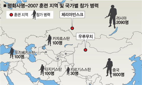 Áß±¹ ·¯½Ã¾Æ Ä«ÀÚÈ彺ź ¿ìÁŰ½ºÅº ŸÁöŰ½ºÅº ۸£±â½º½ºÅº µî »óÇÏÀÌ Çù·Â±â±¸(SCO) 6°³ ȸ¿ø±¹ÀÌ Âü°¡ÇÏ´Â ¡®ÆòÈ»ç¸í-2007¡¯ ¿¬ÇÕÈÆ·ÃÀÌ ¿À´Â 9¡17ÀÏ ·¯½Ã¾ÆÀÇ ¿ì¶ö»ê¸Æ ºÎ±Ù ü¸®¾ßºó½ºÅ©¿Í Áß±¹ ½ÅÀå(ãæË²)ÀÚÄ¡±¸ Áö¿ª¿¡¼ ½Ç½ÃµÈ´Ù.