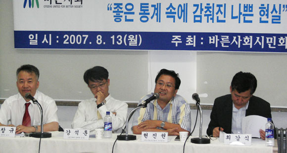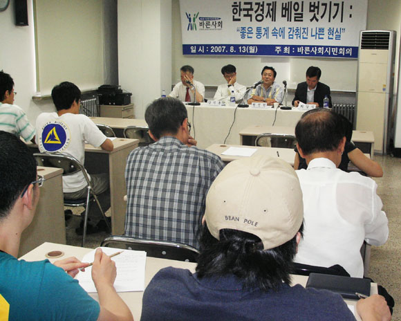 'Çѱ¹°æÁ¦ º£ÀÏ ¹þ±â±â : ÁÁÀº Åë°è ¼Ó¿¡ °¨ÃçÁø ³ª»Û Çö½Ç'À» ÁÖÁ¦·Î ÇÑ À̹ø Åä·Ðȸ´Â ÇöÁø±Ç (¹Ù¸¥»çȸ½Ã¹ÎȸÀÇ »ç¹«ÃÑÀå. ¾ÆÁÖ´ë °æÁ¦ÇÐ) ±³¼öÀÇ »çȸ·Î °¼®ÈÆ(¼º½Å¿©´ë), ÃÖ°½Ä(¿¬¼¼´ë), ÃÖâ±Ô(¸íÁö´ë) ±³¼ö µîÀÌ Âü¿©Çß´Ù.