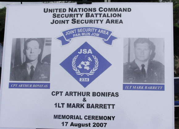 8¡¤18µµ³¢¸¸Çà»ç°Ç ¹ß»ý ÇÏ·ç Àü³¯ÀÎ 17ÀÏ ¿ÀÀü 10½Ã, ´ç½Ã ºÏÂÊ Áö¿ª ½Ã¾ß¸¦ °¡·Î¸·´Â ¹Ì·ç³ª¹« °¡ÁöÄ¡±â ÀÛ¾÷À» ÇÏ´Ù ¼øÁ÷ÇÑ ¹Ì·ç³ª¹«°¡ À§Ä¡ÇÑ ÇöÁö(À¯¿£Ãø 3ÃÊ¼Ò¿Í 4ÃÊ¼Ò »çÀÌ ±¤Àå)¿¡¼ °ÅÇàµÈ ¾Æ´õ º¸´ÏÆÄ½º(Arthur Bonifs) ´ëÀ§¿Í ¸¶Å© ¹Ù·¹Æ®(Mark Barrett) ÁßÀ§ Ã߸ð½Ä¿¡´Â ¹Ì À°±º¼º ³» ±º¼öÁö¿ø»ç·É°üÀÎ Àè ½ºÅøÁî(Jack Stultz) ÁßÀå, ¹Ú¼¼È¯ ÀçÇⱺÀÎȸ À°±ººÎȸÀå°ú ±è±Ô È£±¹¾Èº¸±¹Àå, ´ç½Ã Çѱ¹±º Áß´ëÀå ±è¹®È¯ (¿¹) ´ëÀ§¿Í JSA Àü¿ìȸ¿ø, 1»ç´Ü ÇàÁ¤ºÎ»ç´ÜÀå°ú Àüµ¿Áø JSA ´ë´ëÀå, ±×¸®°í ±èµ¿ÇÑ ´ë¼ºµ¿¸¶À» ÀÌÀå µî ¸¶À»Áֹΰú ÇÑ¹Ì À庴 µî 150¿©¸íÀÌ Âü¼®ÇÑ °¡¿îµ¥ ¾ö¼÷ÇÑ °¡¿îµ¥ °ÅÇàµÇ¾ú´Ù.