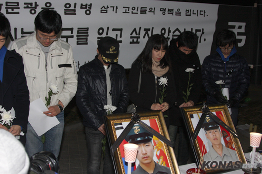 26ÀÏ ¿ÀÈÄ 6½Ã ¼¿ï ±¤È¹® µ¿¾ÆÀϺ¸ ¾Õ¿¡¼ ÀÌµé ´Üü´Â, Åð±ÙÇÏ´Â ½Ã¹ÎµéÀÌ Á¶¹®ÇÒ ¼ö ÀÖµµ·Ï Èñ»ýÀÚµéÀÇ ºó¼Ò¸¦ ¸¶·ÃÇß´Ù.