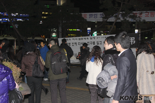 ÇÑÆí, ÀÌµé ´ëÇлýµéÀÌ ¸¶·ÃÇÑ ºó¼Ò¿¡´Â ½Ã¹ÎµéÀÇ ¹ß±æÀÌ ÁÙÀ» À̾úÀ¸¸ç, ½Ã¹ÎµéÀº ¼ÕÀ» ¸ðÀ¸¸ç °¡½¿ ¾ÆÆÄÇÏ´Â ¸ð½ÀÀ¸·Î ¾ÖµµÇß´Ù. ¹ß°ÉÀ½ÀÌ ¹Ù»Û ½Ã¹Îµéµµ ¸Õ°ÉÀ½¿¡ ºó¼Ò¸¦ Çѵ¿¾È ¹Ù¶óº¸¸ç °íÀεéÀ» ±â¸®´Â ÇൿÀ» º¸¿©Áá´Ù.(konas)