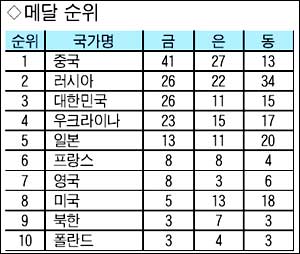 Áß±¹(±Ý41¡¤Àº27¡¤µ¿13)°ú ·¯½Ã¾Æ(±Ý26¡¤Àº22¡¤µ¿34)°¡ °¢°¢ 1, 2À§. Çѱ¹Àº ·¯½Ã¾Æ¿Í ±Ý¸Þ´Þ ¼ö°¡ °°¾ÒÁö¸¸ Àº¸Þ´Þ¿¡¼ 11°³°¡ Àû¾ú´Ù.
