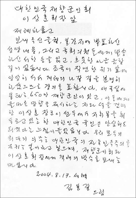 ±è ±³¼ö´Â ÆíÁö¿¡¼ "ÀÌ È¸ÀåÀÌ º¸³»ÁֽŠÆíÁö¸¦ Àаí Èå¹µÇÑ ¸¶À½ ±ÝÇÒ ±æ ¾ø½À´Ï´Ù. Á¶±¹ÀÌ Á÷¸éÇÑ À§±â ¾Õ¿¡ ´ç´çÈ÷ ¼¼ °Ü·¹ÀÇ ³ª°¥ ±æÀ» ºÐ¸íÈ÷ ÇϼÌÀ¸¹Ç·Î °æÀǸ¦ Ç¥ÇÕ´Ï´Ù"¶ó°í ¸»Çϰí "¾Ö±¹½É¿¡ ºÒŸ´Â 650¸¸ ÀçÇⱺÀÎÀÌ ÀÖ°í, À̵鿡°Ô ¿Ã¹Ù¸¥ ¹æÇâÀ» Á¦½ÃÇÏ´Â Áö¿Í ´öÀ» °âºñÇÑ ÀÌ»óÈÆ À屺ÀÌ ¼±µÎ¿¡¼ ÁöÈÖºÀÀ» Èֵθ£°í ÀÖ´Â ÇÑ ´ëÇѹα¹ ±¹¹ÎÀº ¾È½ÉÇØµµ µÇ°Ú´Ù´Â ´À³¦ÀÌ µé¾ú½À´Ï´Ù"¶ó°í °Ý·Á¸¦ º¸³Â´Ù.