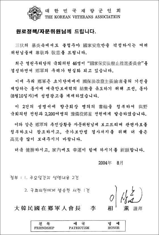 ¾Õ¼ ÀÌ È¸ÀåÀº ÀçÇⱺÀÎȸÀÇ ¿ø·Î/Á¤Ã¥ ÀÚ¹® À§¿ø°ú Àü ¿¹ºñ¿ª À强, ¿©¾ß Àü ±¹È¸ÀÇ¿ø, »çȸÁöµµÃþ ÀÎ»ç µî 3,000¿©¸í¿¡°Ô ÆíÁö¸¦ º¸³» ±¹°¡º¸¾È¹ýÀÌ ÆóÁöµÅ¼´Â ¾ÈµÇ´Â ÀÌÀ¯¸¦ ¼³¸íÇÏ°í ±¹º¸¹ýÀÌ Á¸Ä¡µÇµµ·Ï ÇùÁ¶ÇØ ÁÙ °ÍÀ» È£¼ÒÇß´Ù.