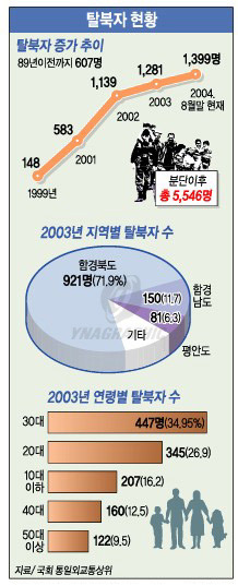 Áö³ÇØ ¸»±îÁö ÀÔ±¹ÇÑ Å»ºÏÀÚ 4õ147¸í °¡¿îµ¥ ³²¼ºÀº 2õ377¸í(54%), ¿©¼º 2õ33¸í(46%)À¸·Î ³²¼ºÀÌ ¿©¼ºº¸´Ù ¸¹¾Ò´Ù. ±×·¯³ª Áö³ 2002³â°ú 2003³âÀÇ °æ¿ì ¿©¼ºÀÌ ³²¼ºº¸´Ù °¢°¢ 111¸í, 345¸í ¸¹Àº °ÍÀ¸·Î ³ªÅ¸³ª´Â µî ÃÖ±Ù ¿©¼º Å»ºÏÀÚÀÇ ÀÔ±¹ÀÌ Å©°Ô ´Ã¾î Á¶¸¸°£ `¿©ÃÊÇö»ó'À¸·Î ¿ªÀüµÉ °ÍÀ¸·Î Àü¸ÁµÈ´Ù.