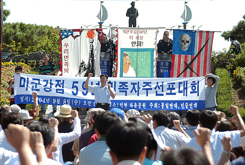 Çö½ÇÀº ºÏ°ú ³²ÀÇ ¿Â °Ü·¹°¡ ¹Ì±¹ÀÇ °±Ç°ú ÀüȾ, Áö¹è¿Í °£¼·Ã¥µ¿À» ÁþºÎ½Ã°í ÀüÀïÀÇ ±Ù¿øÀ» ¼ÛµÎ¸®Ã¤ ¾ø¾Ö¹ö¸®´Â ¹Ì±ºÃ¶¼öÅõÀï¿¡ ÇÑ»ç¶÷°°ÀÌ ¶³Ãijª¼³°ÍÀ» ¿ä±¸ÇϰíÀÖ½À´Ï´Ù.