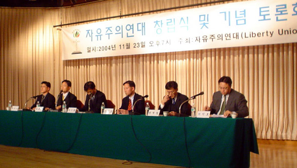 11¿ù 23ÀÏ ¿ÀÈÄ 7½Ã ¸íµ¿ ÀºÇ࿬ÇÕȸ°ü ±¹Á¦ ȸÀǽǿ¡¼ ÀÚÀ¯ÁÖÀÇ ¿¬´ëÀÇ °ø½Ä ⸳½Ä°ú ±â³ä Åä·Ðȸ°¡ ¿·È´Ù. ÀÌ ÀÚ¸®¿¡´Â ¾à 180 ¿©¸íÀÌ Âü¼®, ÀÚ¸®¸¦ ¸Þ¿ü´Ù. ÁÂÀ͵éÀÇ Çà»ç¿Í´Â È®¿¬È÷ ´Ù¸£°Ô, ±¹¹ÎÀǷʸ¦ ½ÃÀÛÀ¸·Î Çà»ç¸¦ ÁøÇàÇß´Ù.