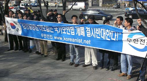 ÀÚÀ¯º¸¼öÁÖÀÇ Ã»³â´Üü ¡®¹«ÇÑÀüÁø¡¯(ÀÎÅͳݹü±¹¹Î±¸±¹ÇùÀÇȸ ȸ¿ø´Üü)Àº À̳¯ ±¹È¸ ¾Õ¿¡¼­ ±âÀÚȸ°ßÀ» °®°í ¡°¿©´çÀÌ ±¹¹ÎÀÇ ¹Ý´ë¿©·Ð¿¡µµ ºÒ±¸ÇÏ°í ½Ã±ÞÈ÷ ±¹º¸¹ý ÆóÁö¸¦ ½ÃµµÇÏ·Á´Â °ÍÀº ´ëÇѹα¹ÀÇ Ã¼Á¦¸¦ ¿¬¸»¿¡ ³¡Àå³»ÀÚ´Â ±×µéÀÇ ¼Ó³»¸¦ ¿©½ÇÈ÷ º¸¿©ÁÖ´Â °Í¡±À̶ó°í ºñ³­À» °¡Çß´Ù.