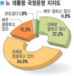 ³ë ´ëÅë·ÉÀÌ ÀçÀÓ Áß ÀßÇÑ ÀϷδ Á¤Ä¡¡¤ÅëÀÏ¡¤¿Ü±³¡¤¾Èº¸ºÐ¾ß¿¡¼ ¡®¾ø´Ù¡¯(25.9%) ¡®±ÇÀ§ÁÖÀÇ Ã»»ê¡¯(24.3%) ¡®ºÎÆÐû»ê¡¯(16.3%)¼øÀ̾ú°í, °æÁ¦¡¤¹Î»ýºÐ¾ß¿¡¼´Â ¡®¾ø´Ù¡¯(33.3%) ¡®Á¾Çպε¿»ê¼¼ µµÀÔ¡¯(29.1) ¡®»ç±³À°ºñ Àý°¨ ±³À°°³Çõ¡¯(12.0%)ÀÌ ²ÅÇû´Ù. Á¤´çÁöÁöµµ´Â Çѳª¶ó´ç 30.3%,¿¸°¿ì¸®´ç 26.2%,¹ÎÁֳ뵿´ç 12.2%,¹ÎÁÖ´ç 3.8%,Àڹηà 0.7%ÀÌ¸ç ¡®¾ø´Ù¡¯°¡ 26.8%¿´´Ù.