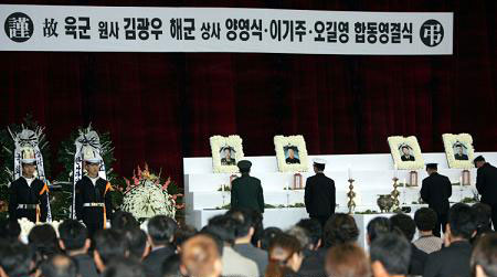 °íÀÎÀÌ µÈ 4¸íÀÇ ÇØ.À°±º ¿ë»ç´Â ½Ã½ÅÀ» ¼ö½ÀÇÏÁö ¸øÇØ Áö³­ 10¿ù 22ÀÏ ÁøÇØ ÇØ±ºÀÛÀü»ç·ÉºÎ¿¡¼­ ¹®Á¤ÀÏ ÇØ±ºÂü¸ðÃÑÀå µî ÇØ±º °ü°èÀÚ¿Í À¯°¡Á· µîÀÌ Âü¼®ÇÑ °¡¿îµ¥ ½ÇÁ¾ÀÚµéÀÇ ¼ÕÅé°ú ¸Ó¸®Ä«¶ô µî  ¿µÇö(çÈúé)À¸·Î¸¸ ÇÕµ¿¿µ°á½ÄÀ» °¡Á³¾ú´Ù. (konas)