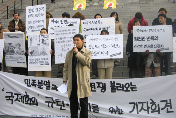 ÇÑÆí, ±¹Á¦È¸Àǰ¡ ½ÃÀ۵DZâ Àü Çà»çÀå ¾Õ¿¡¼´Â ¼ºÎÁö¿ª ¹ÎÁß¿¬´ë, ¼ºÎÃÑ·Ã, 6.15 ûÇп¬´ëµîÀÌ Âü°¡ÇÑ ¡®ºÏÇÑÀαÇ․³¹Î¹®Á¦ ±¹Á¦È¸ÀÇ¡¯ ±Ôź ¹× ÀúÁö¸¦ À§ÇÑ ±âÀÚȸ°ßÀÌ ÁøÇàµÆ´Ù. À̵éÀº ±âÀÚȸ°ß¹®À» ÅëÇØ ¡°À̹ø ±¹Á¦È¸ÀÇ´Â ±¹³»¿Ü¿¡ ¹ÝºÏ¿©·ÐÀ» È®»êÇÏ°í ³²ºÏ´ë°áÁÖÀǸ¦ °íÃë½Ã۰íÀÚ ÇÏ´Â Á¤Ä¡Àû ¸ñÀûÀ» °¡Áø ȸÀǷμ ½ÇÁúÀûÀÎ ºÏÀαǰ³¼±°ú °ü·Ã¾ø´Â ¡®±¹Á¦ÀûÀÎ ¹ÝÀαÇȸÀÇ¡¯¶ó°í ºñ³Çß´Ù. À̵éÀº ±¹Á¦È¸Àǰ¡ ½ÃÀÛµÈ °°Àº ½Ã°£, ¿· °Ç¹°¿¡¼ ¡°¹ÎÁ·ÈÇØ¿Í ºÏÇÑÀαǡ±À̶ó´Â ÁÖÁ¦·Î Åä·Ðȸ¸¦ °³ÃÖÇÏ´Â µî ±¹Á¦È¸ÀÇ ±â°£µ¿¾È ±âÀÚȸ°ß°ú Åä·Ðȸ, °Å¸®¼±ÀüÀüÀ» Æì´Â µî À̹ø ȸÀÇ¿¡ ´ëÇÑ È°µ¿À» ÇÒ °ÍÀÓÀ» ¹àÇû´Ù.(konas)