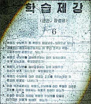 8ÀÏ Áß¾ÓÀϺ¸°¡ ÀÔ¼öÇØ º¸µµÇÑ ºÏÇÑ ±º ³»ºÎ ºñ¹Ð¹®°ÇÀÎ 'ÇнÀÁ¦°'¿¡´Â ±èÁ¤ÀÏ¿¡ ´ëÇÑ À§ÇØ(êËúª) ¿ì·Á¸¦ Á¦±âÇÏ¸é¼ ÀÌ¿¡ ´ëÇÑ Ã¶ÀúÇÑ ´ëºñ¸¦ Ã˱¸ÇÑ ³»¿ëÀÌ µé¾îÀÖ´Ù. ÀÌ ¹®°ÇÀº Á¶¼±ÀιαºÃâÆÇ»ç°¡ ¹ß°£ÇÑ A4¿ëÁö 39ÂÊ ºÐ·®À¸·Î À强±Þ ±º ÇÙ½É °£ºÎ¿Í ±º°ü(Àå±³)µé¿¡°Ô ±³À°¿ëÀ¸·Î Á¦ÇÑ ¹èÆ÷µÈ °ÍÀ¸·Î ¹ß°£ ½Ã±â´Â 2004³âÀ̶ó°í ½Å¹®Àº ¹àÇû´Ù.