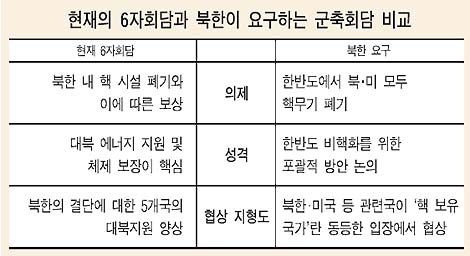 ù°´Â 6ÀÚȸ´ãÀ» »ç½Ç»ó ¹Ì¡¤ºÏ ¾çÀÚȸ´ãÀ¸·Î º¯Çü½ÃŰ·Á´Â µ¥ ¸ñÀûÀÌ ÀÖ´Ù. ºÏÇÑÀº ȸ´ãÀÇ ¼º°Ý, ¸ñÇ¥¸¦ ºÏÇÑÀÇ ÇÙ Æó±â º¸´Ù ºÏÇÑ¿¡ ´ëÇÑ ¹Ì±¹ÀÇ ÇÙ À§Çù û»ê¿¡ µÎ°í, ³²ÇÑ¿¡ ÀÖ´Â ¹Ì±¹ÀÇ ÇÙ¹«±â Á¦°Å ¹®Á¦¸¦ ÀÚ±âµé°ú ³íÀÇÇÏÀÚ°í ÁÖÀåÇϰí ÀÖ´Ù. ±×·¯´Ï±î Çѹݵµ¿¡ ÀÖ´Â ¹Ì±¹ ÇÙ¹«±â¿Í ºÏÇÑ ÇÙ¹«±â °¨Ãà ¹®Á¦¸¦ ÇÔ²² ´Ù·ç¾î¾ß Çϸç À̸¦ À§Çؼ´Â ¹Ì¡¤ºÏ ¾çÀÚÇù»óÀÌ ºÒ°¡ÇÇÇÏ´Ù´Â ³í¸®¿¡ ÀÔ°¢Çϰí ÀÖ´Ù.