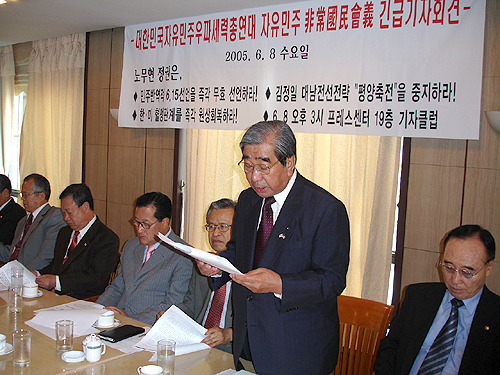 ÀÚÀ¯Áø¿µÀÇ ÁÖ¿äÀλçµéÀº 8ÀÏ ÇÁ·¹½º¼¾ÅÍ¿¡¼ `ÀÚÀ¯¹ÎÁÖºñ»ó±¹¹ÎȸÀÇ °á¼ºÁغñÀ§¢¥¸¦ °á¼º, ±âÀÚȸ°ßÀ» ¿°í "³ë¹«Çö ´ëÅë·ÉÀº Á¤»óȸ´ã¿¡¼ ºÏÇÑÀÇ ÇÙ Æ÷±â¸¦ À§ÇÑ Çѹ̰£ Á¤Ã¥Á¶À²¿¡ ÃÖ¼±À» ´ÙÇÏ°í ¢¥ÇѹÌÇ÷¸Í¢¥À» ¿ø»ó ȸº¹½ÃÄÑ¾ß ÇÑ´Ù"°í Ã˱¸Çß´Ù.