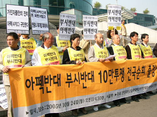 ¶Ç, ¡®Àü±¹ ¼ø·Ê´Ü¡¯À» ±¸¼ºÇϰí, ¼¿ï, °¿ø, ´ëÀü, ºÎ»ê µîÁö¿¡ Áý°áÇØ ±× Áö¿ª ³ëµ¿ÀÚ¿Í ³ó¹Î, ºó¹Î, û³âÇлýµéÀ» Á¶Á÷ÇØ Áö¿ª Áֹε鿡°Ô ÀڽŵéÀÇ ÁÖÀåÀ» È«º¸ÇÒ ¿¹Á¤ÀÌ´Ù. ÀÌ¾î ´ÙÀ½ ´Þ 17ÀÏ¿¡´Â ¸ðµç Âü°¡ÀÚµéÀÌ APEC ȸÀǰ¡ ¿¸®´Â ºÎ»ê¿¡ Áý°áÇØ Àü¾ßÁ¦¸¦ °®°í, 18ÀÏ 1Â÷ ¹ü±¹¹Î´ëȸ, 19ÀÏ 2Â÷ ¹ü±¹¹Î´ëȸ µîÀÇ ¼ø¼·Î ¹Ý APEC Áýȸ¸¦ °¡Áú °èȹÀÌ´Ù. ÀÌ Áýȸ¿¡´Â ³ó¹Î 5¸¸ ¸í, ¹ÎÁÖ³ë Á¶ÇÕ¿ø 2¸¸ ¸í, ºó¹Î 1¸¸ ¸í, ÇØ¿Ü NGO 1000¸í µî ¸ðµÎ 10¸¸ ¸íÀÌ Âü°¡ÇÒ ¿¹Á¤.