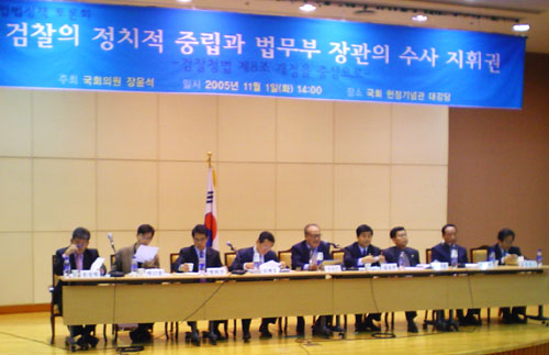 1ÀÏ ¿ÀÈÄ ±¹È¸ ÇåÁ¤±â³ä°ü ´ë°´ç¿¡¼´Â Çѳª¶ó´ç ÀåÀ±¼® ÀÇ¿ø »çȸ·Î °ËÂûû¹ý Á¦8Á¶ °³Á¤À» Áß½ÉÀ¸·Î ÇÑ '°ËÂûÀÇ Á¤Ä¡Àû Á߸³°ú ¹ý¹«ºÎ Àå°üÀÇ ¼ö»çÁöÈÖ±Ç'¿¡ ´ëÇÑ ÀÔ¹ý Á¤Ã¥ Åä·Ðȸ°¡ ¿·È´Ù.