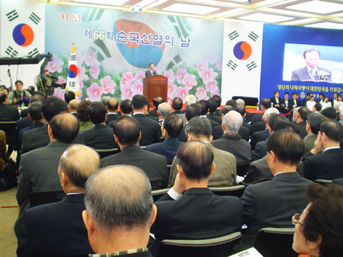 ±¹°¡º¸ÈÆÃ³(óÀå ¹ÚÀ¯Ã¶) ÁÖ°üÀ¸·Î °³ÃÖÇÑ Áß¾Ó±â³ä½Ä¿¡´Â ÀÌÇØÂù ±¹¹«ÃѸ®¸¦ ºñ·ÔÇØ ±è±¹ÁÖ ±¤º¹È¸Àå, »ýÁ¸¾Ö±¹Áö»ç¿Í µ¶¸³À¯°øÀÚ À¯Á·, °¢°è ÁÖ¿äÀλç, Çлý µî 700¿©¸íÀÌ Âü¼®ÇÑ °¡¿îµ¥ ¡ã¾à»çº¸°í ¡ã±â³ä°ø¿¬ ¡ãµ¶¸³À¯°øÀÚ Æ÷»ó Àü¼ö ¡ã±¹¹«ÃѸ® ±â³ä»ç ¡ã¼ø±¹¼±¿ÀÇ ³¯ ³ë·¡ ¼øÀ¸·Î ÁøÇàµÇ¾ú´Ù.