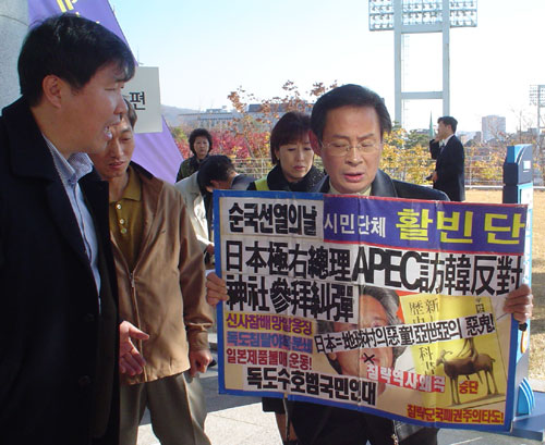ÇÑÆí ÀÌ ³¯ Çà»ç°¡ ½ÃÀ۵DZâ Àü ½Ã¹Î´Üü Ȱºó´Ü È«Á¤½Ä ´ëÇ¥°¡ Àü³¯ ÀϺ»´ë»ç°ü ¾Õ°ú ³²»ê ¾ÈÁß±Ù ÀÇ»ç µ¿»ó, ±è±¸¼±»ý µ¿»ó µîÀ» ¼øÈ¸Çϸç ħ·«ÁÖÀÇ ºÎȰ ±âµµ¸¦ ȹåÇÏ´Â °íÀÌÁî¹Ì ìíÃѸ® ±Ôź ¹× APEC¹æÇÑ ÀúÁö ±ä±Þ½ÃÀ§¸¦ °¡Áøµ¥ À̾î À̳¯µµ Çà»çÀå ÀÔ±¸¿¡¼ µ¶¸³À¯°øÀÚ µî Âü¼®ÀÚµéÀ» ´ë»óÀ¸·Î кìí¿îµ¿¿¡ ³ª¼³ °ÍÀ» È£¼ÒÇÏ´Ù°¡ À̸¦ ÀúÁöÇÏ´Â Çà»ç ¿ä¿øµé°ú ¸ö½Î¿òÀ» ¹úÀ̱⵵ Çß´Ù.