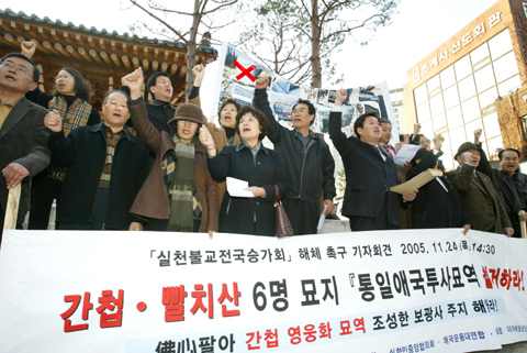 ¡ãÁö³­ ´Þ 24ÀÏ ¾È±¹¿ª ±Ù¹æ '½Çõ½Â°¡È¸'(ÅëÀϾֱ¹Åõ»ç ¹¦¿ª Á¶¼ºÀ» ÁÖµµÇÑ ´Üü) °Ç¹° ¾Õ¿¡¼­ ½Â°¡È¸ ÇØÃ¼¸¦ ¿ä±¸ÇÏ¸ç ¼º¸íÀ» Àаí ÀÖ´Â ¾Ö±¹½Ã¹ÎµéÀÇ ¸ð½À