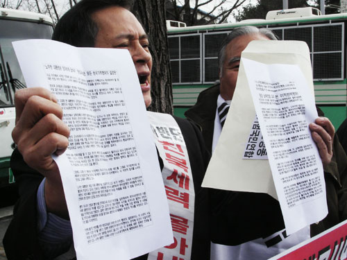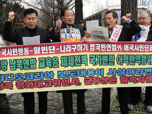 À̾î À̵é ȸ¿øµéÀº '³²ºÏ¿¬¹æÁ¦ ±³À° À¢ ¸»À̳Ä, Á¤ºÎ´Â Á¤È®ÇÏ°Ô Áø»óÀ» ¹àÇô¶ó' 'û¿Í´ë´Â ÃæºÐÇÏ°Ô ÇØ¸íÇ϶ó' µîÀÇ ±¸È£¸¦ ¿ÜÄ¡¸ç û¿Í´ë·Î Ç×ÀÇ ¼º¸íÀ» Àü´ÞÇϱâ À§ÇØ ÇàÁøÀ» ½ÃÀÛÇß´Ù.