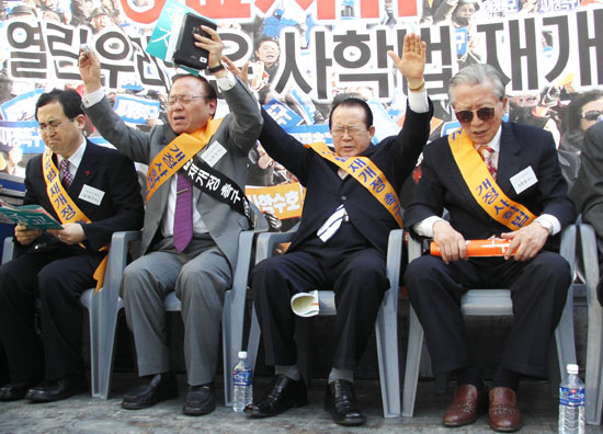 ½ÅÀÚµéÀº '¿­¿ì´çÀº »çÇйý Àç°³Á¤¿¡ µ¿ÂüÇ϶ó' 'Á¾±³ÀÚÀ¯ »çÇÐÀÚÀ²' µîÀÇ ±¸È£¸¦ ¿ÜÄ¡°í Çսɱ⵵¿¡¼­µµ ¹Ýµå½Ã »çÇйý Àç°³Á¤À» ÇØ´Þ¶ó°í Å« ¸ñ¼Ò¸®·Î ±âµµ¿¡ ÀÓÇϱ⵵ Çß´Ù.