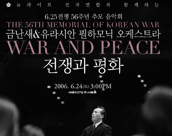 6¡¤25 ÀüÀïÀ» Ã߸ðÇÏ´Â À½¾ÇȸÀÎ ¸¸Å­ ¿¬ÁֵǴ À½¾Çµµ ÀüÀïÀÇ Âü»ó°ú °ü·ÃµÈ ³»¿ëÀ¸·Î ä¿öÁø´Ù. ·¯½Ã¾Æ Á¦±¹¿¡ Ç×°ÅÇß´ø ÇɶõµåÀÇ À̾߱⸦ ´ãÀº '½Ãº§¸®¿ì½ºÀÇ °íÇâ½Ã', Á¦ 2Â÷ ¼¼°è ´ëÀü ´ç½Ã ³ªÄ¡ÀÇ À¯´ëÀÎ ÇлìÀ» ´ãÀº ¼î½ºÅ¸ºñÄ¡ÀÇ 'è¹ö½ÉÆÛ´Ï', ³ªÆú·¹¿ËÀÇ ¸ð½ºÅ©¹Ù ħ°ø°ú ·¯½Ã¾ÆÀÇ ½Â¸®¸¦ ³ë·¡ÇÑ Â÷ÀÌÄÚÇÁ½ºÅ°ÀÇ '¼­°î' µîÀÌ ¿¬ÁÖµÉ ¿¹Á¤ÀÌ´Ù. ¶Ç 'µ¿½ÉÃÊ', '±×¸®¿î ±Ý°­»ê', '¾Æ¸®¶û', 'Çѱ¹È¯»ó°î' µî Çѱ¹ÀÇ ¸í°îµµ ¿¬ÁֵȴÙ.