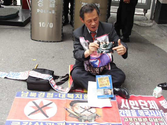 ±×·±µ¥ ÀÌ ³¯ ¾Ö±¹½Ã¹Î´ÜüÀÇ ±âÀÚȸ°ß°ú È« ´ÜÀåÀÇ 1ÀνÃÀ§°¡ ÁøÇàµÇ´Â ¿·¿¡¼´Â '³²ºÏ°øµ¿¼±¾ð ½Çõ¿¬´ë'¼Ò¼Ó ÇÑ È¸¿øÀÌ '6¡¤15°øµ¿¼±¾ð ÀÌÇà ÀεµÀû ´ëºÏ Áö¿ø Áï°¢ Àç°³Ç϶ó'°í ÀûÈù ÇÇÄÏÀ» µé°í ħ¹¬½ÃÀ§¸¦ ¹úÀ̰í ÀÖ¾ú´Ù. ±×·¯³ª À̵éÀº ¼·Î ´«±æÀ» ¸¶ÁÖÄ¡Áö´Â ¾Ê¾Ò´Ù. (Konas)