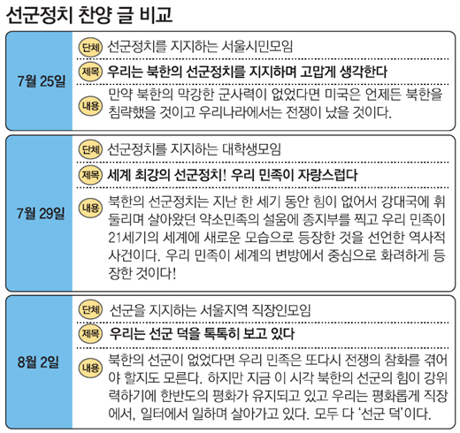 µ¿¾ÆÀϺ¸, Á¶¼±ÀϺ¸, Çѱ¹ÀϺ¸, ¹®ÈÀϺ¸ µî ÁÖ¿ä Àϰ£Áö´Â º»Áö Ä®·³ÀÌ ³ª°£ ÈÄ 6․15°øµ¿¼±¾ð½ÇÇö°ú Çѹݵµ Æòȸ¦ À§ÇÑ ÅëÀÏ¿¬´ë(ÀÌÇÏ ÅëÀÏ¿¬´ë), Á¶±¹ÅëÀϹü¹ÎÁ·Ã»³âÇлý¿¬ÇÕ(ÀÌÇÏ ¹üûÇзà ³²Ãøº»ºÎ), Á¶±¹ÅëÀϹü¹ÎÁ·¿¬ÇÕ ³²Ãøº»ºÎ(ÀÌÇÏ ¹ü¹Î·Ã ³²Ãøº»ºÎ) µî Ä£ºÏ´Üü ȨÆäÀÌÁö °Ô½ÃÆÇ¿¡ ¡®¼±±º(à»ÏÚ)Á¤Ä¡¡¯¸¦ Âù¾çÇÏ´Â ±ÛµéÀÌ µ¿½Ã´Ù¹ßÀûÀ¸·Î °ÔÀçµÈ °ÍÀ» º¸µµÇß´Ù.