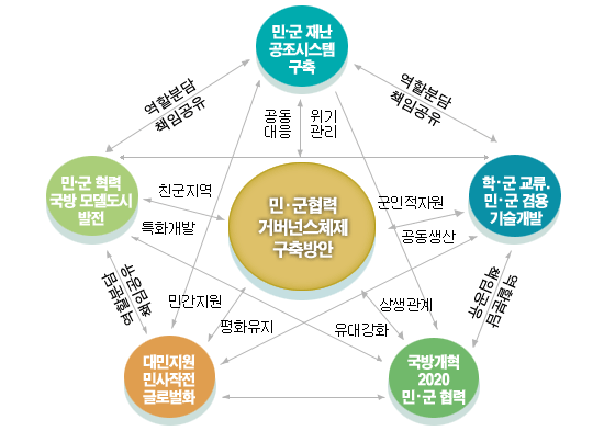 ÃÖ ºÎÀåÀº À̸¦ À§ÇØ Á¦½ÃÇÑ ¡®¹Î¡¤±ºÇù·Â °Å¹ö³Í½ºÃ¼Á¦ ±¸Ãà¹æ¾È'À¸·Î ¡ã¹Î¡¤±º °øÁ¶½Ã½ºÅÛ ±¸Ãà ¡ã¹Î¡¤±º Çù·Â ±¹¹æ¸ðµ¨ µµ½Ã¹ßÀü ¡ãÇС¤±º ±³·ù, ¹Î¡¤±º °â¿ë ±â¼ú°³¹ß ¡ã´ë¹ÎÁö¿ø ¹Î»çÀÛÀüÀÇ ±Û·Î¹úÈ ¡ã±¹¹æ°³Çõ2020°ü·Ã ¹Î¡¤±º Çù·Â °È·Î ¡®Ã¥ÀÓ°øÀ¯È¡¯¿Í ¡®¿ªÇҺд㡯 µî 5°³ ¾ÈÀ» Á¦½ÃÇØ ÀÌ °°Àº ¹æ¾ÈÀÌ ÅëÇÕÀû ±¸Á¶¿¡ ÀÔ°¢ÇÒ ¼ö ÀÖÀ» ¶§, ¹Î¡¤±º Çù·Â °Å¹ö³Í½ºÃ¼Á¦ ±¸Ãà¹æ¾ÈÀÌ ±× ½ÇÈ¿¼ºÀ» È®º¸ÇÒ ¼ö ÀÖÀ» °ÍÀ̶ó°í °Á¶Çß´Ù.