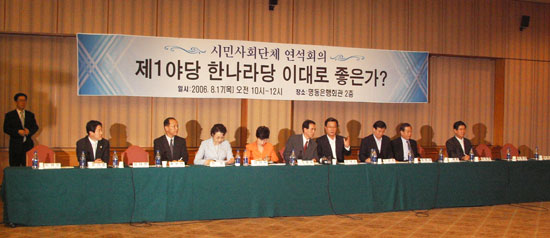 'Á¦1¾ß´ç, Çѳª¶ó´ç ÀÌ´ë·Î ÁÁÀº°¡?' ¸¦ ÁÖÁ¦·Î ÇÑ '½Ã¹Î»çȸ´Üü ¿¬¼®È¸ÀÇ'´Â ¼¿ï ¸íµ¿ ÀºÇ࿬ÇÕȸ°ü¿¡¼ 10½ÃºÎÅÍ 2½Ã°£ µ¿¾È ÁøÁöÇÑ ºÐÀ§±â ¼Ó¿¡¼ À̾îÁ³´Ù. ÀÌ ÀÚ¸®¿¡ Âü¼®ÇÑ ±è±¤µ¿ ³ª¶óÁ¤Ã¥¿ø ¿øÀåÀ» ºñ·ÔÇÑ 12¸íÀÇ ÆÐ³ÎµéÀº Çѳª¶ó´çÀÌ ³»³â ´ë¼±¿¡¼ ÁÂÆÄÁ¤±ÇÀ» ¹«³Ê¶ß¸®°í »õ·Î¿î Á¤±ÇÀ» âÃâÇϱâ À§Çؼ´Â ºÐ¸íÇÑ Á¤Ã¼¼º°ú À̳äÀû °¡Ä¡°üÀ» È®¸³ÇÏ°í »À¸¦ ±ð´Â ÀÚ±â¹Ý¼º°ú »ì½Å¼ºÀÎ, Á¤Ã¥Á¤´çÀ¸·ÎÀÇ Å»¹Ù²ÞÀ» ÅëÇØ ±¹¹Î¿¡°Ô ¾îÇÊÇÏ°í ±¹¹Î °çÀ¸·Î ´Ù°¡°¡´Â Á¤´çÀÌ µÇ¾î¾ß ÇÒ °ÍÀ̶ó°í ÀÔÀ» ¸ð¾Ò´Ù.