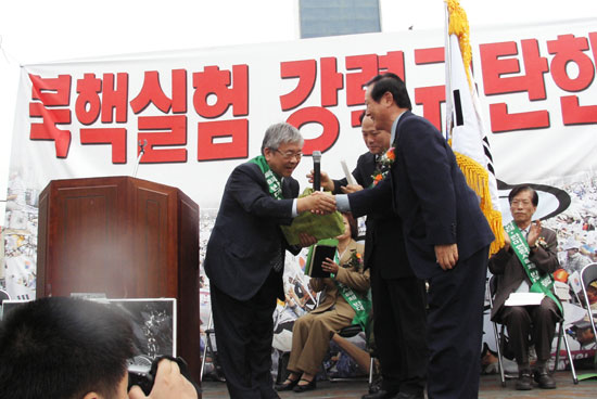 ´ëȸ Âü¼®ÀÚµéÀº 'Á¤ºÎ´Â ÇÞºµÁ¤Ã¥ ½ÇÆÐ¸¦ ÀÚÀÎÇÏ°í ±¹¹Î ¾Õ¿¡ ¾þµå·Á »çÁËÇ϶ó' 'ºÏÇÑÇÙ½ÇÇè ±ÔźÇϰí Çѹ̿¬ÇÕ»ç ÇØÃ¼ ¹Ý´ëÇ϶ó' 'ÇÙ¹«±â Áõ°­ ÀúÁöÇϱâ À§ÇØ ±Ý°­»ê °ü±¤, °³¼º°ø´Ü, ´ëºÏ Çö±Ý ¹°ÀÚÁö¿øÀ» Àü¸é Áß´ÜÇ϶ó' µîÀÇ ±¸È£¸¦ ¿ÜÃÆ´Ù.