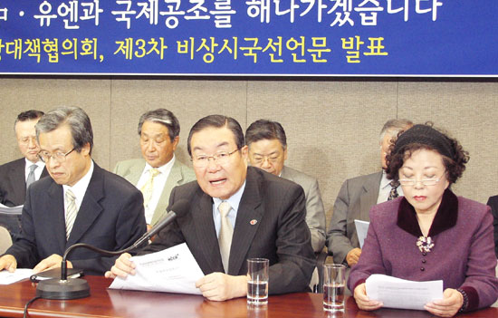 ¡ã ±¹°¡ºñ»ó´ëÃ¥ÇùÀÇȸ´Â 26ÀÏ ¿ÀÀü ¼­¿ï Çѱ¹ÇÁ·¹½º¼¾ÅÍ¿¡¼­ Á¦3Â÷ ºñ»ó½Ã±¹¼±¾ðÀ» ¹ßÇ¥Çß´Ù. ±¹ºñÇùÀº ÀÌ ³¯ ½Ã±¹¼±¾ð ¹ßÇ¥¸¦ ÅëÇØ ±¹ºñÇùÀÌ ¹Ì ÀÏ Áß À¯¿£°ú ±¹Á¦°øÁ¶¸¦ ÅëÇØ ºÏÇÑÇÙ¿¡ ´ëÃ³ÇØ ³ª°¡°Ú´Ù°í ¹àÇû´Ù. 3Â÷ ºñ»ó½Ã±¹¼±¾ð¿¡´Â °¢°è Àλç 200¸íÀÌ Âü¿©Çß´Ù. ¨Ïkonas.net