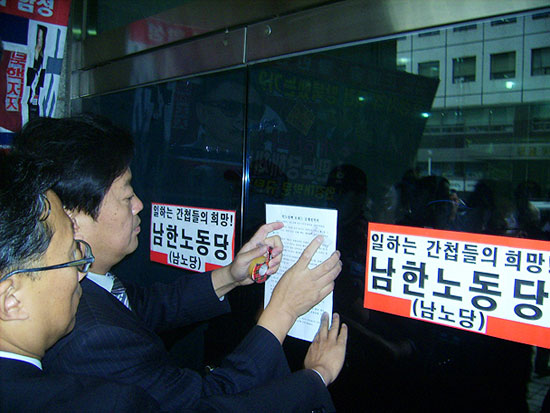 ÀÌ ³¯ ¿ÀÈÄ 2½Ã ¹Î³ë´ç»ç ¾Õ¿¡¼ °¡Áø ±âÀÚȸ°ß¿¡¼ ȸ¿øµéÀº ¹Î³ë´çÀÇ ·Î°íÀÎ 'ÀÏÇÏ´Â »ç¶÷µéÀÇ Èñ¸Á ¹ÎÁֳ뵿´ç' À̶ó´Â Ç¥¾î¸¦ ºø´ë¾î 'ÀÏÇÏ´Â °£Ã¸µéÀÇ Èñ¸Á ³²Çѳ뵿´ç'ÀÌ¶ó ¾º¿©Áø Ç¥¾î¸¦ ´ç ÇöÆÇÀ¸·Î »ç¿ëÇ϶ó¸ç ´ç»ç°¡ µé¾îÀÖ´Â Çö°ü À¯¸®¹®¿¡ ºÎÂøÇϱ⵵ Çß´Ù.