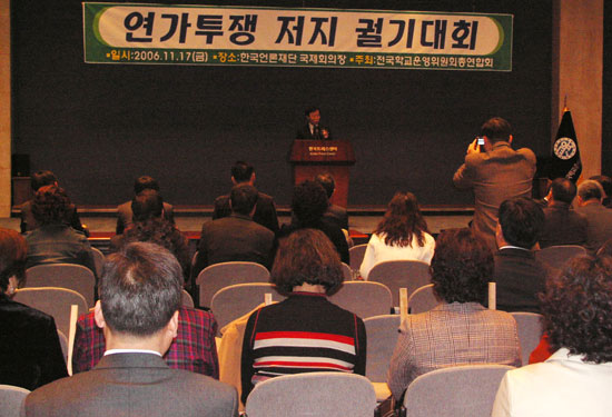 °ø±³À°ÀÇ Á¤»óȸ¦ ¿°¿øÇÏ´Â Àü±¹ÀÇ Çкθ𸦠´ë½ÅÇØ Çб³ ¿î¿µÀ§¿øµé·Î ±¸¼ºµÈ 'Àü±¹Çб³¿î¿µÀ§¿øÈ¸ÃÑ¿¬ÇÕȸ'(ÀÌÇÏ ÀüÇзÃ)ÁÖÃÖ ¿î¿µÀ§¿øµéÀÇ '¿¬°¡ÅõÀï ÀúÁö ±È±â´ëȸ'°¡ Àü±¹ÀÇ Çб³ ¿î¿µÀ§¿ø ´ëÇ¥µéÀÌ Âü¼®ÇÑ °¡¿îµ¥ 2006³â ÃÑȸ¿Í °çµé¿© °³ÃֵǾú´Ù.