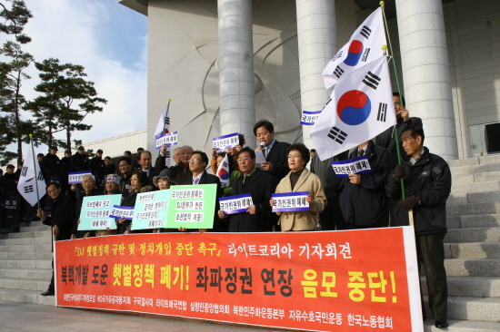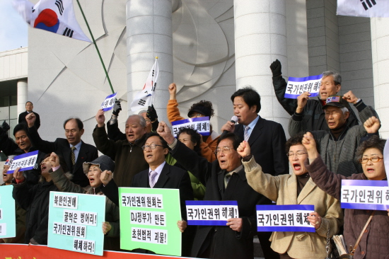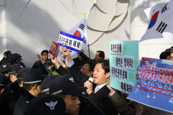 ¶óÀÌÆ® ÄÚ¸®¾Æ µî ÀÚÀ¯Áø¿µ ´Üü ȸ¿øµéÀº ±è´ëÁß îñ´ëÅë·É¿¡°Ô ¼º¸í¼¸¦ Àü´ÞÇϱâ À§ÇØ ±â³ä½ÄÀåÀ¸·Î ÇâÇßÀ¸³ª ¹Ì¸® ¹èÄ¡µÈ °æÂûµéÀÇ ÀúÁö·Î µé¾î°¡Áö ¸øÇÏÀÚ '±è´ëÁßÀº ±¹¹Î¿¡°Ô »çÁËÇ϶ó''ºÏÇÑÀ뱂 ¿Ü¸éÇÏ´Â ±¹°¡ÀαÇÀ§¿øÈ¸ ÇØÃ¼Ç϶ó''±¹º¸¹ý Æó±â ±Ç°íÇÑ ±¹°¡ÀαÇÀ§ ÇØÃ¼Ç϶ó' µîÀÇ ±¸È£¸¦ ¿ÜÄ¡¸ç °æÂû°ú ´ëÄ¡ÇÏ´Ù ÀÚÁøÇØ»êÇß´Ù.